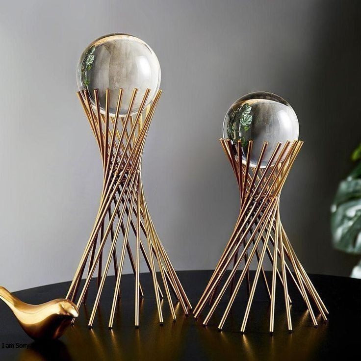 Modern elegance meets artistic design — golden spiral stands with crystal spheres that add a touch of luxury and sophistication to any space. Perfect as a statement decor piece for your home or office.
